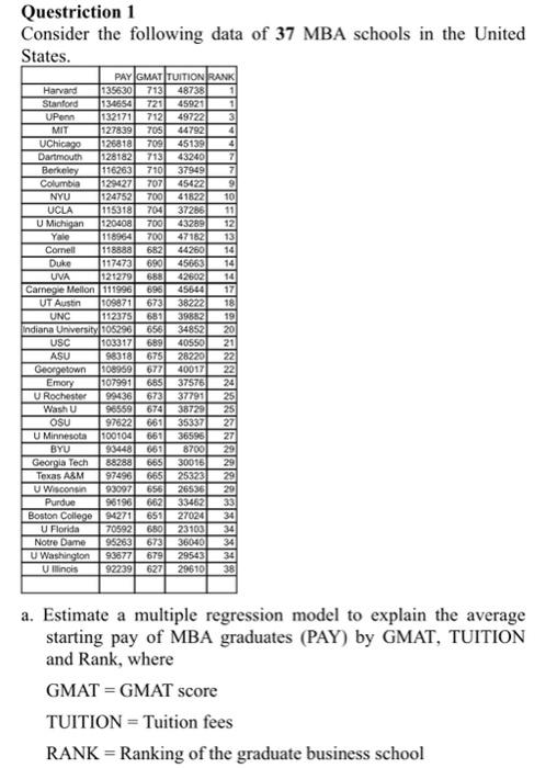 Solved Questriction 1 Consider The Following Data Of 37 Mba Chegg Com